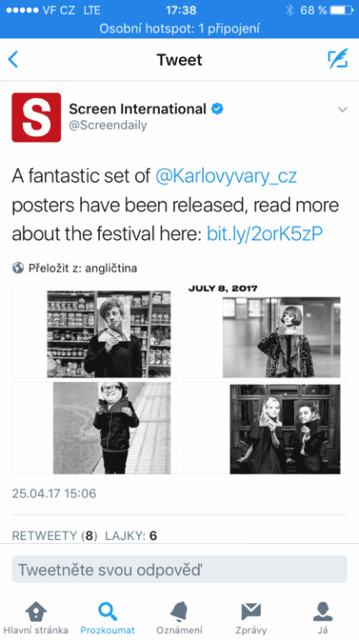 Jiří Bartoška, Zuzana Lednická a Aleš Najbrt odtajnili oficiální plakáty 52. ročníku Mezinárodního filmového festivalu Karlovy Vary. Autory vizuálů, které pokračují v kombinaci typografie s fotografiemi rozličných návštěvníků festivalu a vztahů mezi celebritami a obyčejnými lidmi, jsou Zuzana Lednická, Aleš Najbrt, Michal Nanoru a Václav Jirásek. „Na internetu nikdo neví, že jste pes,“ říká klasický vtip o virtuální anonymitě. „Já je někdo jiný,“ říká Zuzana Lednická, ale ve skutečnosti to byl Arthur Rimbaud. „Malkovich, Malkovich, Malkovich...“ říkají hlavy Johna Malkoviche v hlavě Johna Malkoviche Johnu Malkovichovi, který hraje Johna Malkoviche ve filmu V kůži Johna Malkoviche. Každý chce být někým jiným. Každý hraje divadlo. A čím dál víc rolí, nejen na fotkách na Facebooku a Instagramu, ale speciálně při vytržení z každodenního koloběhu jako na festivalu ve Varech. Hra s identitou nebyla nikdy snazší (v tomhle případě stačí jen souhlas portrétovaných hvězd!). Někdo chce být Belmondo nebo krásná Jana Brejchová, někdo, dnes bohužel až příliš často, Spalovač mrtvol. Slavní herci si půjčují identity našich neslavných životů a dávají jim váhu svých obličejů a těl. My se pak do nich promítáme ve filmových i bulvárních příbězích. Dokonce i Aňa Geislerová někdy chce být Aňa Geislerová.