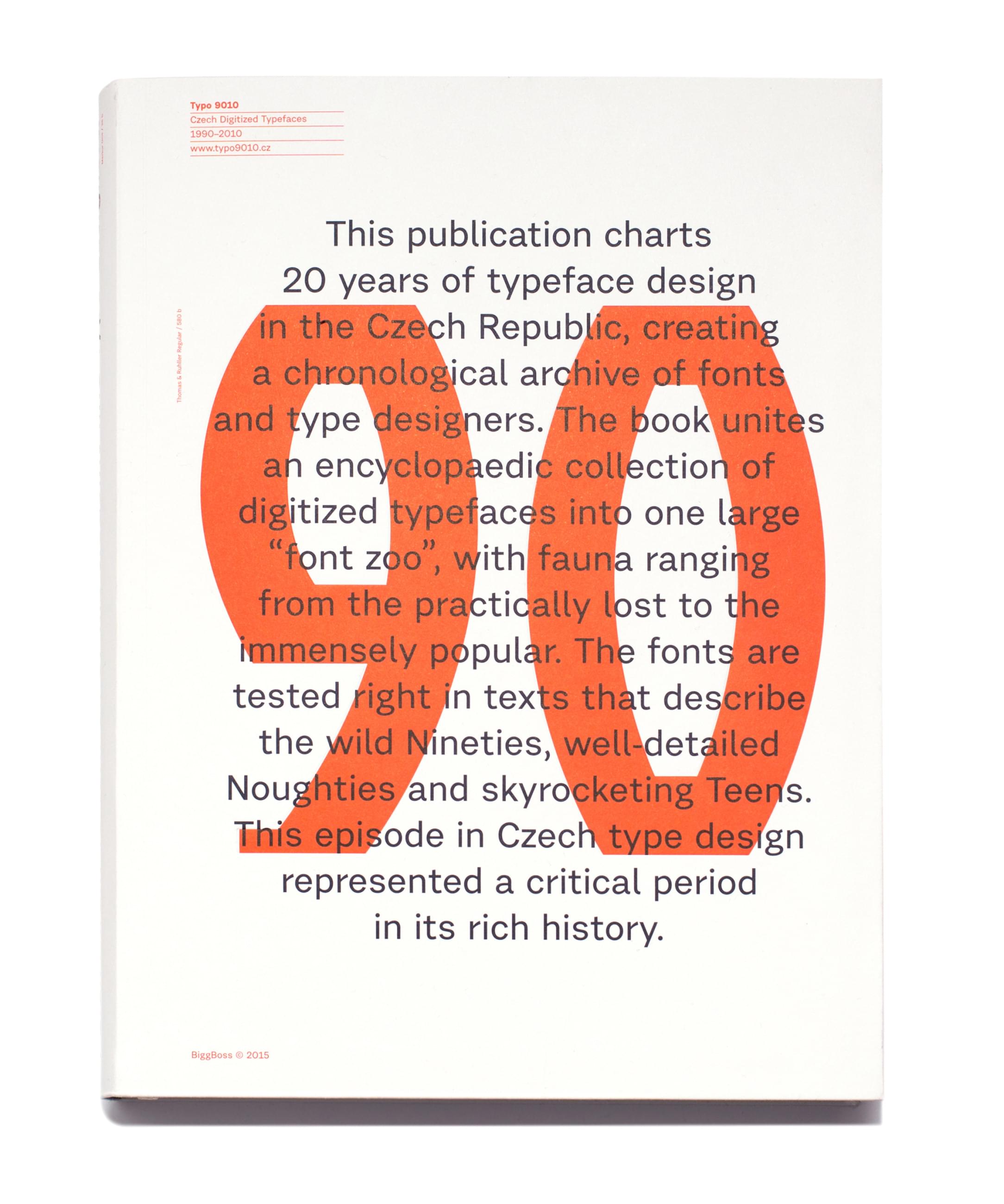 8 texts, 103 designers, 399 fonts, 288 pages, 1902 styles, 9010. Typo 9010 summarizes the history of the Czech digitized fonts between 1990 and 2010, and also acts as a specimen. Unlike traditional specimens, it can be read continuously from beginning to end. Zuzana Lednická used the texts of Petr Babák, Filip Blažek, Veronika Burian, Karel Haloun, Ondřej Chorý, Bas Jacobs, Pavel Noga, Jan Solpera and František Štorm to show alphabets in an actual typesetting. Even though some fonts tried to fight it and the setting is far from your standard setting, the fonts show what’s in them better than on a quick fox jumping over a regular specimen and simultaneously reading the texts is more fun than in a sober design of any academic publication. What’s more, chronological order naturally brings together fonts that would otherwise hardly meet. Combinations of Regent by František Štorm or Mongoloid by Ondřej Chorý with Cubist edges of Reflex by Aleš Najbrt work to your surprise. The whole thing ends with one really big, beautiful period from LSNY by Petr Bosák.