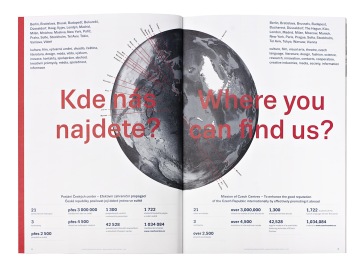 Czech Centres is a network of cultural embassies in twenty-one cities on three continents, which annually prepares over 2,500 projects. That means a lot of photos with very different looks. Bohumil Vašák gave them a single character by converting them to monochrome and connected them with stylized lines and information hubs, which, incidentally, come from extremely zoomed logo of the Czech Centers.
