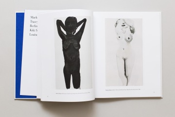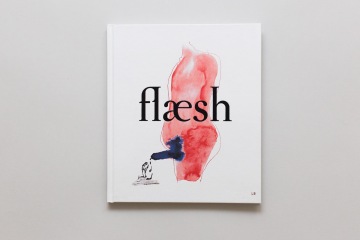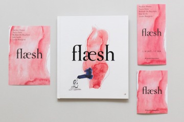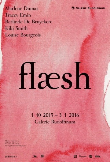 Double-edged title of an exhibition centering on figural output of five eminent international female artists brings attention to the existential flash and the role of the human body (flesh) in contemporary art. The visual style of the exhibition – that as a whole could not be represented by any single piece of sixty exhibited sculptures, drawings, watercolors, pieces of embroidery and installations – builds on shared substance, ambiguous red-pink and a classic typeface infested with strange cartilaginous growths. Detail of material cut from one of Louise Bourgeois’ watercolor nudes, which serves as the title background, looks in good will as watermelon juice, or right as tissue and smeared body fluid.