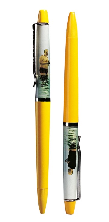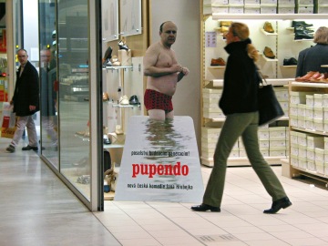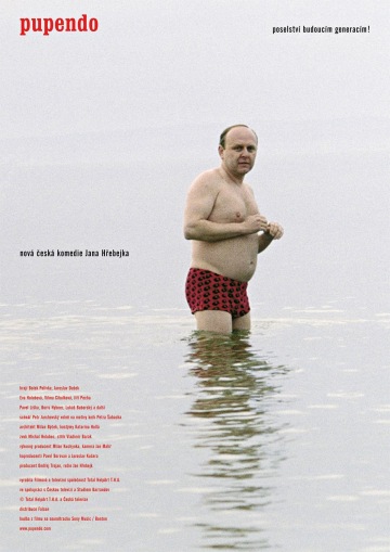 When I went through all photos taken during “Pupendo” production I found a picture showing actors Vilma Cibulková and Jaroslav Dušek standing in the shallow waters of the Balaton lake. They are some ten meters apart, so the photo was rather small. They are waiting, not acting. Dušek’s hands are uncertainly placed on his belly. His eyes are inquisitive, rather blank and resigned. A message to future generations! I cut out the figure in red bathing suit surrounded by the grey expanse of the Balaton “sea”. When blown up from the 35-mm negative, the detail got an out-of -focus, grainy quality. A terribly poor print quality so typical of socialist times was now used for an advertising attack that was supposed to attract millions to Czech cinemas at a time of uncompromising chintzy capitalism.