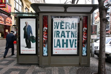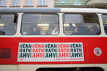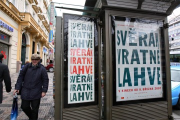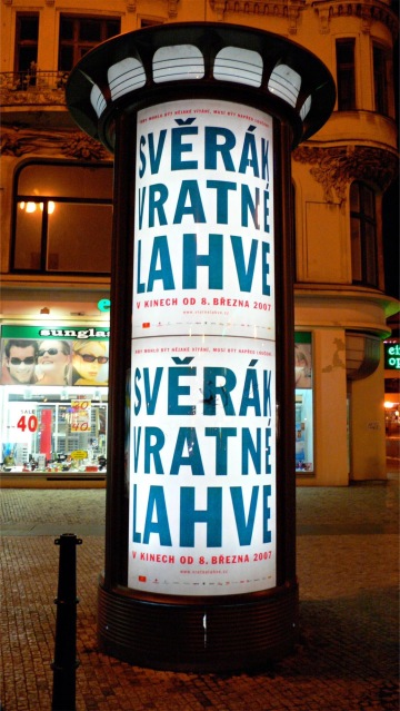 The headline Svěrák Vratné Lahve wound round an imaginary deposit bottle forms a simple idea using generous typography which created a strong film logo. It is used in various kinds of prints such as posters, citylights, movie soundtrack or cinema lobby stand expressing an emptie with a huge diameter of about one meter.