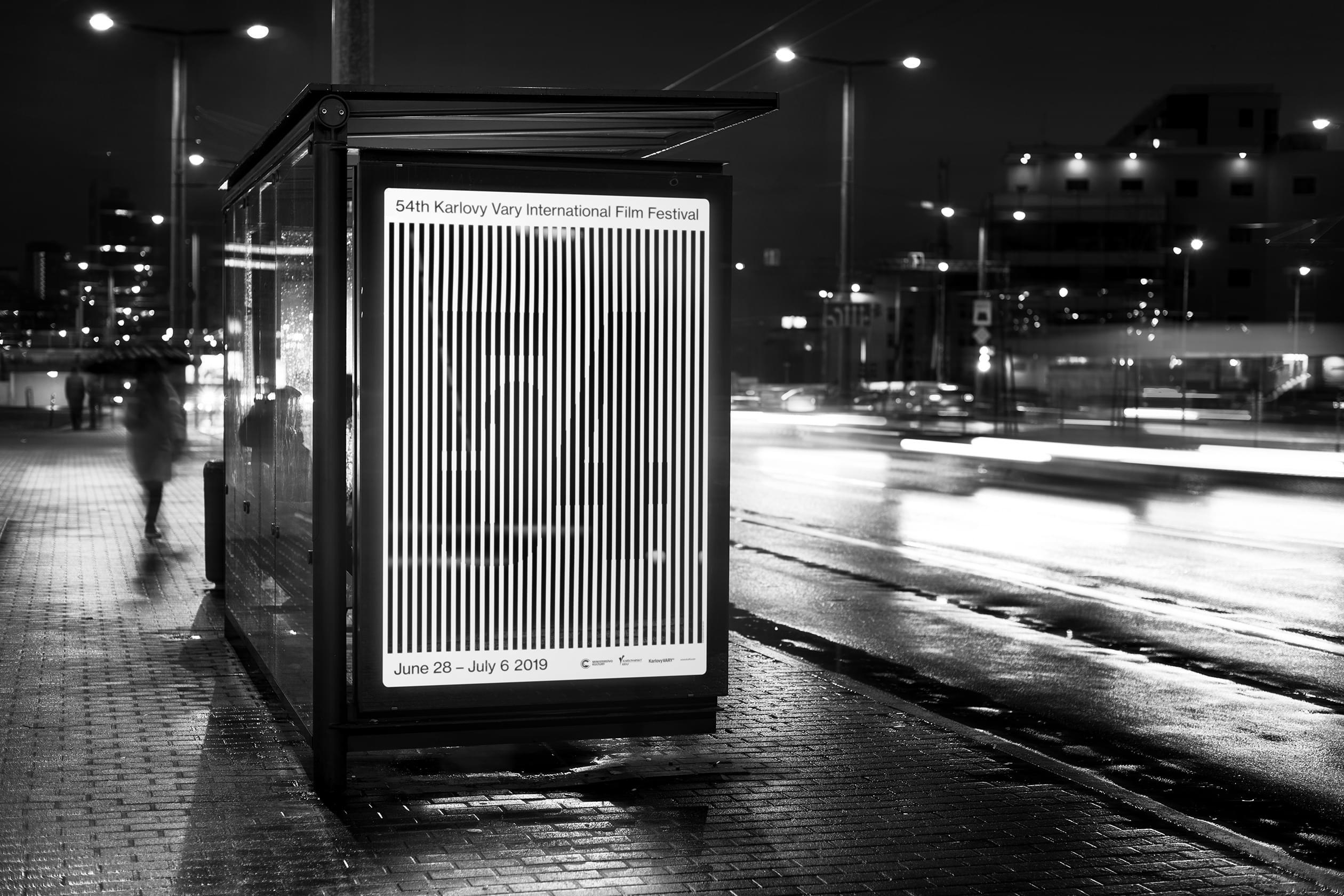Vizuál 54. ročníku KVIFF pokračuje v jednoduché typografii a hře s čísly i viditelností. Po vzpomínce na celuloid z minulého ročníku se posunul v čase, snímkování opustilo filmový rámec a přerodilo se v pruhy. Někdo v nich najde odkaz k TVL, neboli rozlišení analogové televizní obrazovky, někdo k Šíleně smutné princezně. Někdo zebru. Nebo jsou to zas jen císařovy nové šaty? „Vizuál pro KVIFF musí blikat, roztančit oči, znejišťovat, hypnotizovat optickou iluzí jak filmové plátno – a stejně jako na filmové plátno je třeba se na něj dívat trochu s odstupem,“ rozvlnil se jeho autor Jakub Spurný. Všudypřítomné pruhy se tradičně propsaly z plakátu do festivalové architektury, animací, projekcí a merchandisingu, až k nejvděčnější fázi naší práce – do spontánní módní inspirace návštěvníků festivalu.