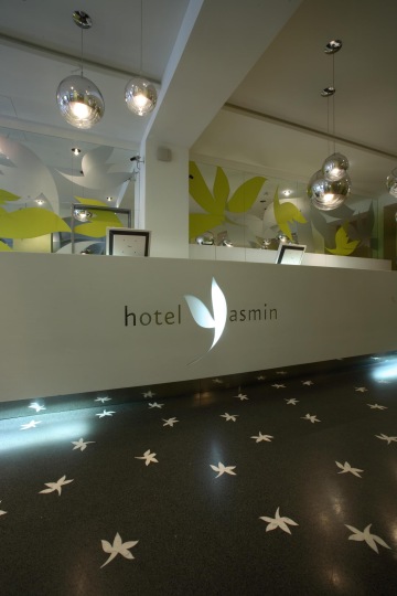 Grafický koncept pro hotel Yasmin vychází z moderní transformace kaligrafického pojetí základního symbolu loga hotelu. Celý vizuální styl pracuje s volně upravovanými rastry, které jsou výrazně zapojeny do interiéru s ohledem na používané materiály. Grafický koncept ovlivňoval od začátku stavby hotelu jeho celkové řešení v úzké spolupráci se studiem Mimolimit.