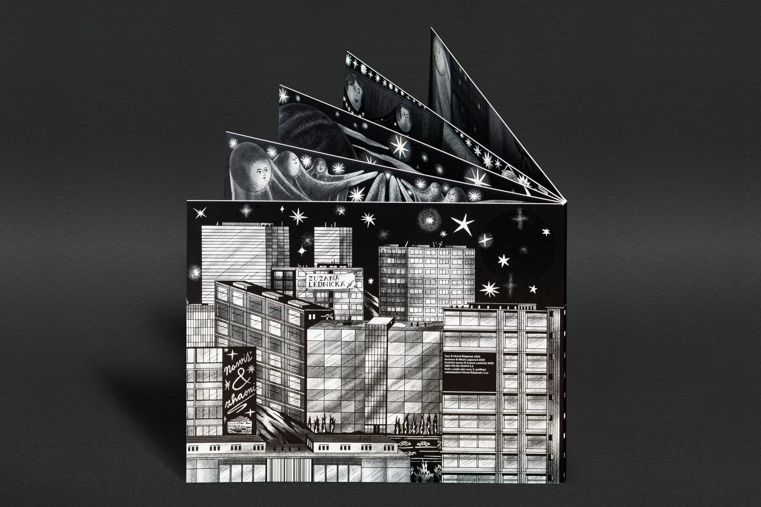 Vyprávění o tmě, které chybí hloubka, vzniklo původně jako pohádka na dobrou noc pro dceru autora a vydavatele Michala Štěpánka. Výtvarnice Nikola Logosová na příběhu postavila černobílý noční svět a Zuzana Lednická krom grafické úpravy přidala rozměrnému leporelu vrstvu luminiscenční́ barvy, která vedla k dalším, tajným vrstvám textu a ilustrací. Pro designérku to znamenalo nečekaný návrat k vlastní diplomové práci z roku 1999 o grafickém studiu, kde se ve dne pracuje a v noci tu bují sny a kreativita. Ateliér nebo dětský pokoj, čím víc světla takovým světům poskytnete, tím budou ve tmě živější.