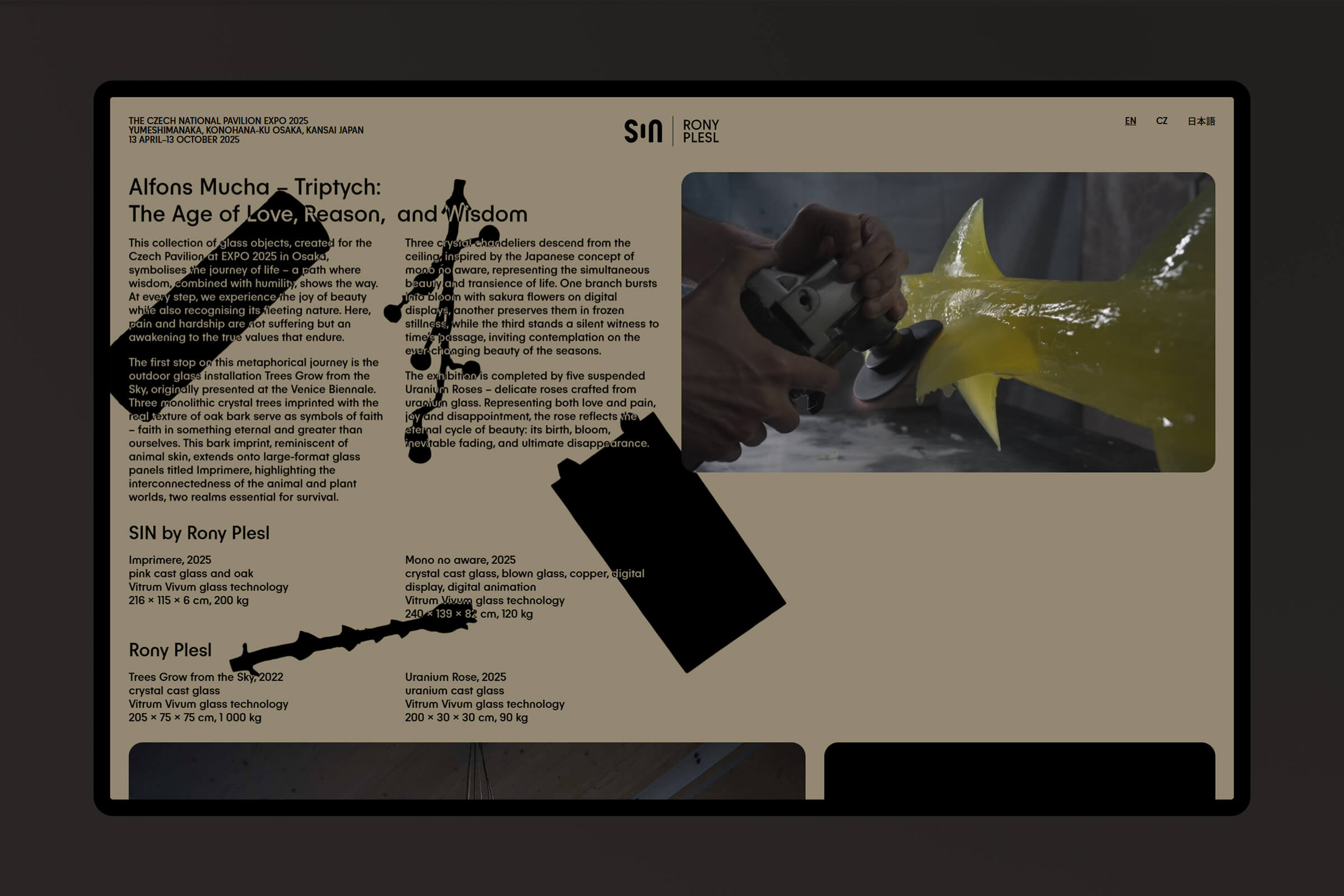 Pro výstavní platformu Sin Studio Gallery, která reprezentuje Českou republiku na světové výstavě EXPO 2025 v japonské Ósace, jsme vytvořili jednoduchý prezentační web stavící na kontrastu mezi čistotou prostoru a experimentálním pojetím levitujících prvků. Ty reprezentují samotné umělecké objekty, které jsou vystaveny v českém pavilonu.